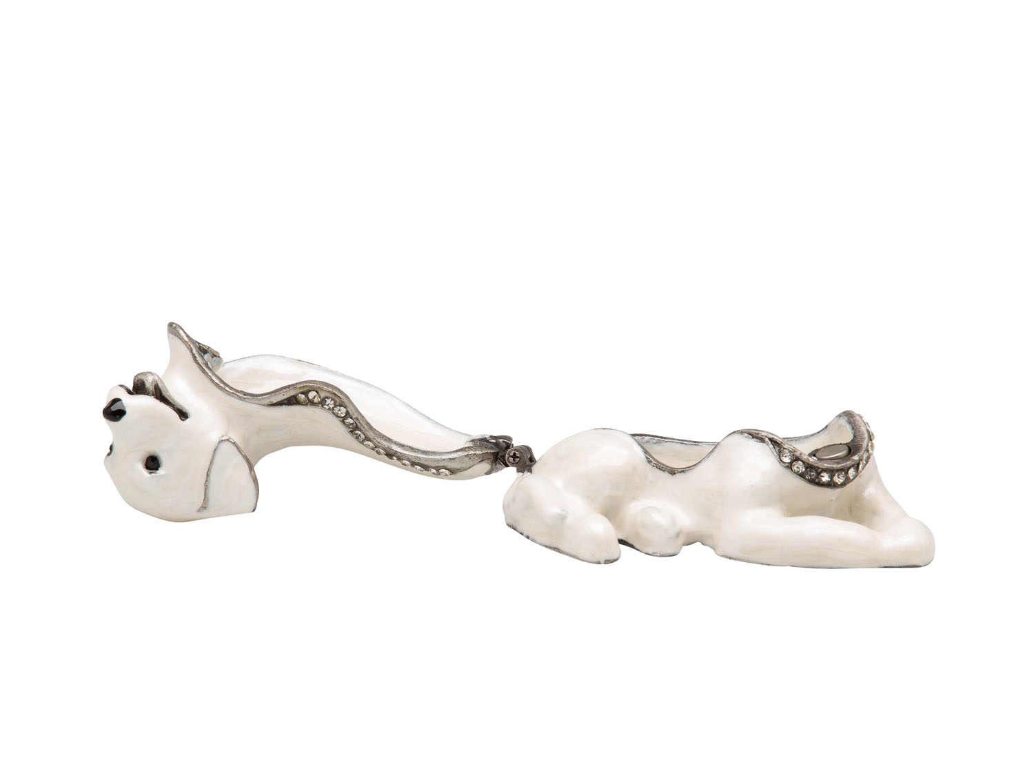 Wunderschöne und massive Schatulle Hund aus Hartzinn nach altem Vorbild hergestellt. Wie auf den Fotos zu sehen eine hochwertige und dekorative Arbeit im antiken Stil. Die Figur ist durch einen Magnet-Verschluss aufklappbar, innen und aussen emailliert. Die reichlich verzierte Miniatur ist mit Strass Stein aufwendig bearbeitet. Eine luxuriöse Aufbewahrungsmöglichkeit für kleine Kostbarkeiten. Die Maße lauten wie folgt: 7 x 4 x 4cm (B x H x T). Das Gewicht beträgt 250 g. Die Dekoration dient nur zum Größenvergleich und ist nicht Bestandteil des Angebotes.